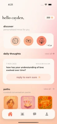 amble premeerib sind sisukate arutelude eest ainulaadsete aura-punktidega, mis avavad rohkem võimalusi uute inimestega kohtumiseks ja sinu profiili nähtavuse suurendamiseks. Kui vestlus peaks soiku jääma, pakub amble loovaid vestlusalgatusi ja juhendatud teemasid, mis aitavad sul süveneda. Olgu teemaks suhted, unistused või kommunikatsioonistiilid – amble hoiab fookuse sellel, mis tõeliselt loeb, pakkudes samal ajal rikastavat dialoogi ja viies sind tõelise mõistmiseni.