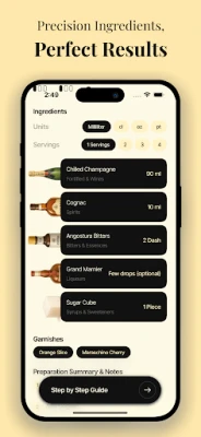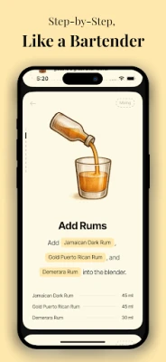 Neati iga retsept on disainitud professionaalset täpsust silmas pidades, pakkudes selgeid mõõtühikuid, detailseid segamistehnikaid, spetsiifilisi klaasnõude soovitusi ja näpunäiteid täiuslike garneeringute loomiseks. Valage ja serveerige enesekindlalt, teades, et iga detail on läbi mõeldud, et teie kokteilid oleksid visuaalselt ja maitseelamusena silmapaistvad. Rakenduse elegantne, minimalistlik ja täiesti reklaamivaba disain asetab esiplaanile puhta loomeprotsessi, pakkudes segamatut ja inspireerivat kasutuskogemust. Neat – teie partner iga suurepärase joogi taga.